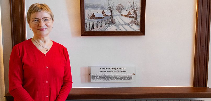 Kolejna artystyczna dusza, która energię czerpie z natury, lokalna przedsiębiorczyni z Wielenia Karolina Jarzębowska prezentuje swoją pracę w „Galerii Jednego Obrazu” w Urzędzie Miejskim w Wieleniu. Obraz „Zimowy spokój w osadzie”został namalowany w 2022 roku, a inspiracją była urokliwa osada Bęglewo w zimowej szacie.