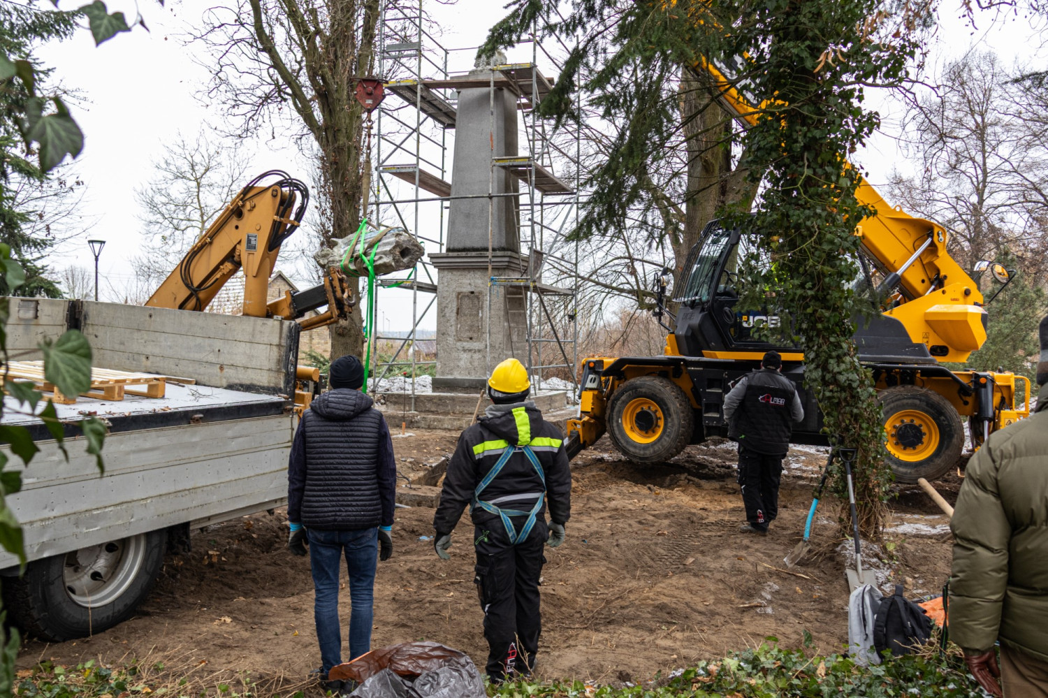 Prace remontowe przy pomniku właśnie się rozpoczęły. Zakres przedsięwzięcia obejmuje m.in. renowację struktury pomnika, odtworzenie herbu zniszczonego w 1939 roku, wykonanie kamiennych schodów, montaż oświetlenia parkowego oraz masztów flagowych.
