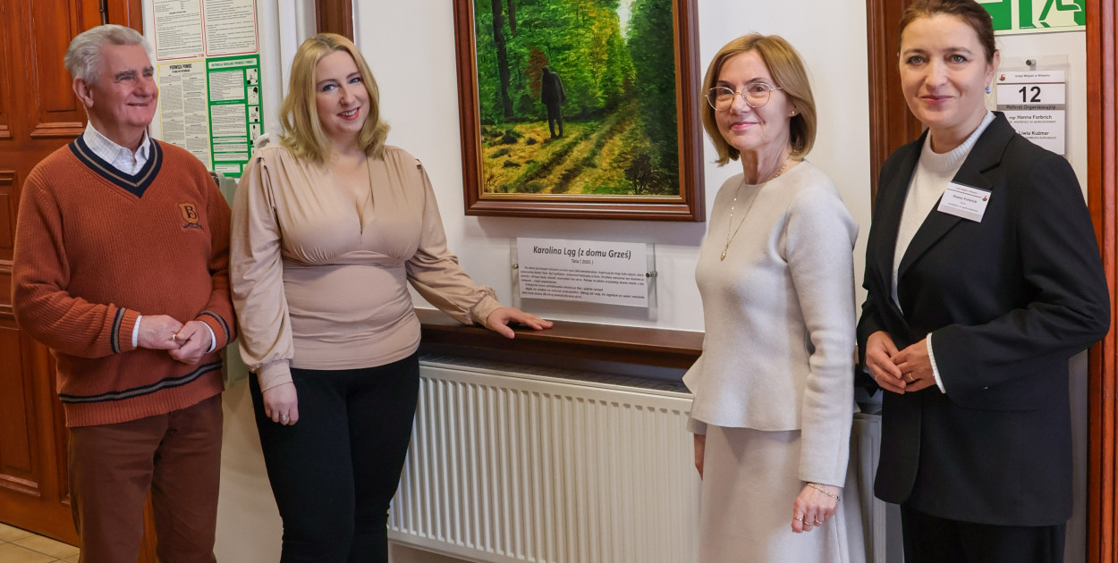 - Inspiracją do niego było zdjęcie, które wykonałam kiedyś Tacie. Był myśliwym i dokarmiał zwierzynę w lesie. Chciałam zatrzymać ten moment w pamięci, dlatego kiedy odszedł, stworzyłam ten obraz. Patrząc na płótno przywołuję dawne chwile z nim związane - ciepłe wspomnienia. Artystyczny talent odziedziczyłam właśnie po Nim - pięknie rysował. Nigdy nie uczyłam się malować profesjonalnie. Maluję jak czuję. Do sięgnięcia po pędzel namówiła mnie moja siostra, dla której powstał pierwszy obraz - powiedziała Karolina Ląg podczas spotkania w urzędzie