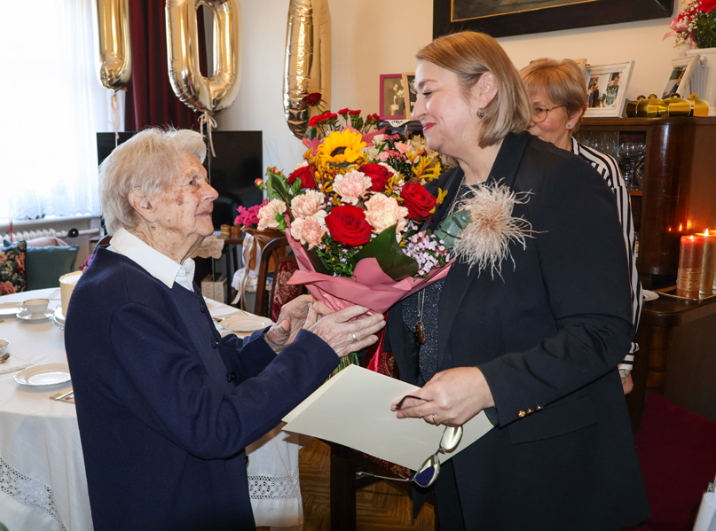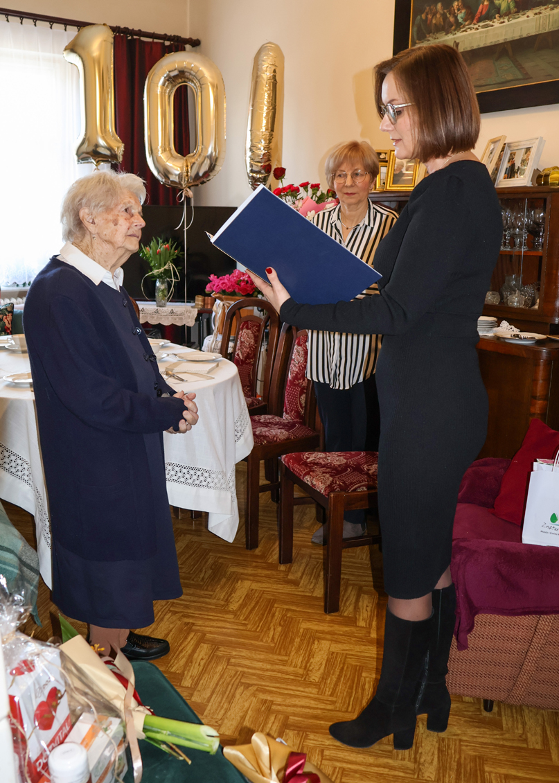 Zwracamy się do Pani w dniu 100-lecia Urodzin. Dane było Pani przeżyć cały wiek naszej polskiej historii, doświadczyć trudów i radości z nią związanych. Tak długie życie jest skarbnicą doświadczeń dla następnych pokoleń. Papież Jan Paweł II w „Liście do ludzi w podeszłym wieku” pisał: „Cechą cywilizacji prawdziwie ludzkiej jest szacunek i miłość do ludzi starszych, dzięki którym mogą oni czuć się żywą częścią społeczeństwa”. Prosimy Panią o przyjęcie serdecznych życzeń, aby każdy kolejny dzień przynosił życzliwość, niegasnący optymizm, zdrowie oraz wszelkie dobro.