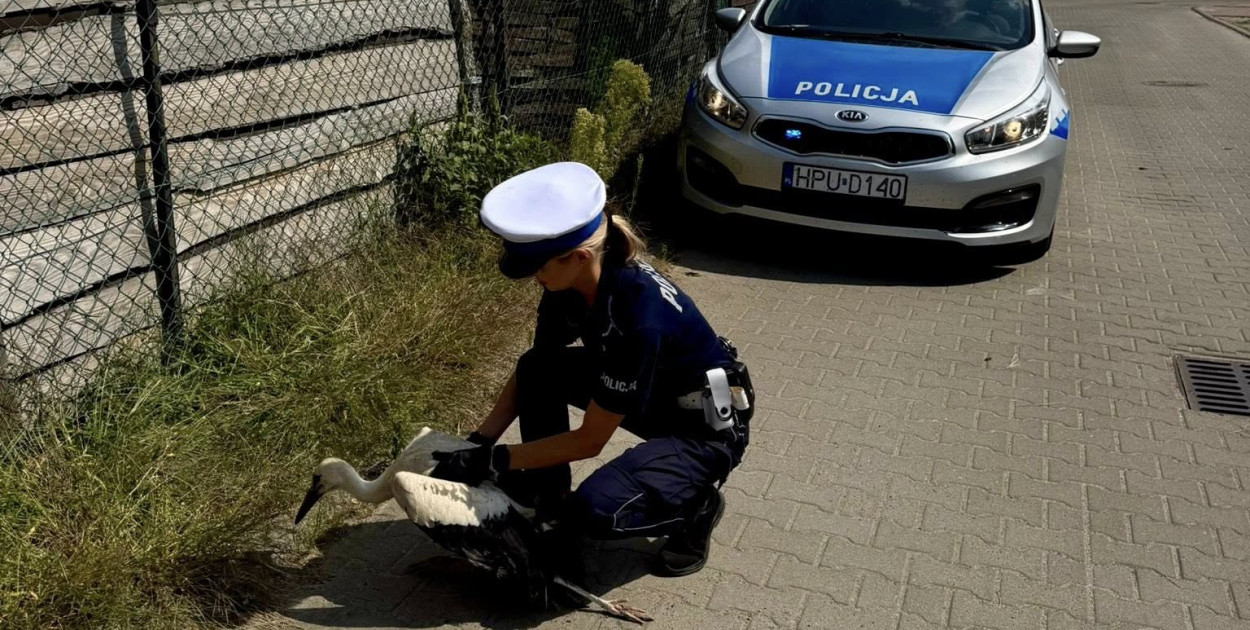 Młody ptak prawdopodobnie złamał nogi. Funkcjonariusze zabezpieczyli go, aby nie leżał na jezdni - tam groziła mu pewna śmierć, a kierowcom niebezpieczeństwo.