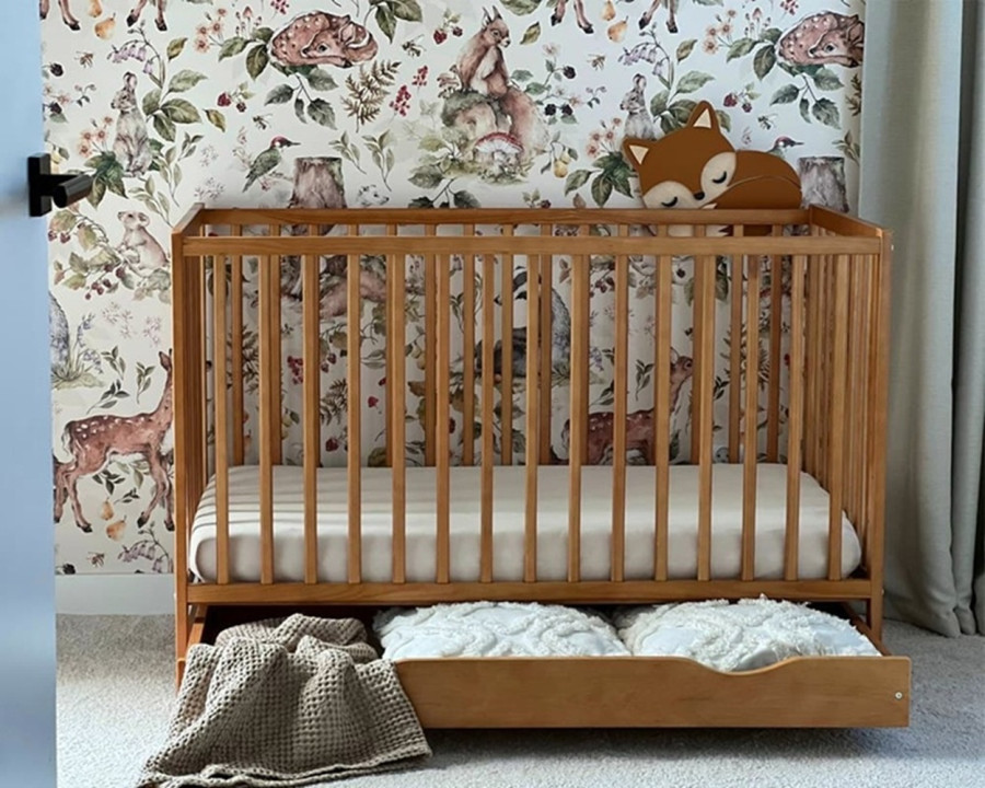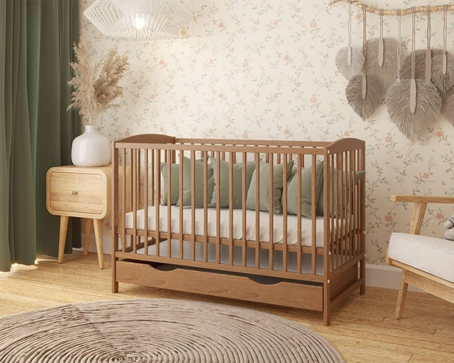 Drewniane łóżeczko doskonale wpisuje się w różnorodne aranżacje wnętrz dziecięcych. Naturalny kolor sosny, biel czy delikatna szarość pozwalają łatwo dopasować mebel do stylu pokoju. Klasyczna forma sprawdza się zarówno w minimalistycznych, jak i bardziej dekoracyjnych przestrzeniach. Modele wyposażone w pojemną szufladę pomagają utrzymać porządek wśród akcesoriów niemowlęcych. Dodatkowa przestrzeń do przechowywania ułatwia codzienną pielęgnację dziecka. Całość tworzy spójną i funkcjonalną strefę snu, sprzyjającą wyciszeniu i odpoczynkowi.